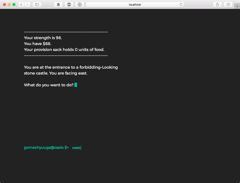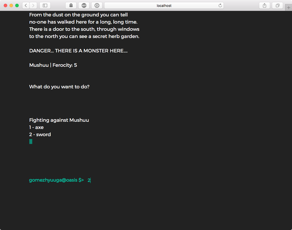 fight: choose to fight a monster if it is present in the room.run: run from the monster if you don’t want to fight. You have to choose where to run (north, south, east, west).