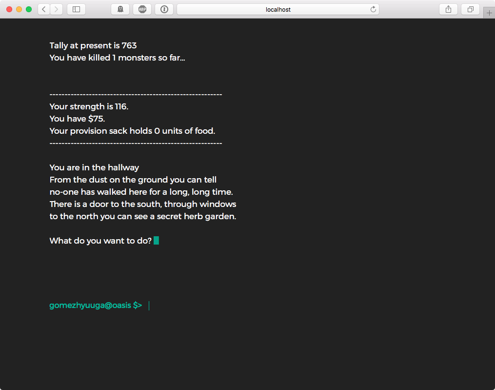 north, south, east, west: move to north, south, east or west, respectively.up, down: if there is any stair, move upstairs or downstairs, respectively.tally: get the stats so far, including how many monsters have you killed, food amount, life points and your strength.consume: if you have food, consume1 unit.pick_up: if there is a treasure in the room, pick it up.magic: use a magic power to move to another random room.